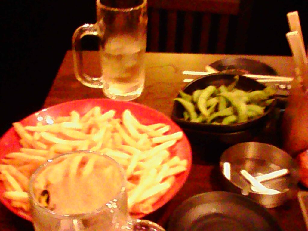 プロデューサーと居酒屋へ。真夜中なのに山盛りポテト。ぐへっ。